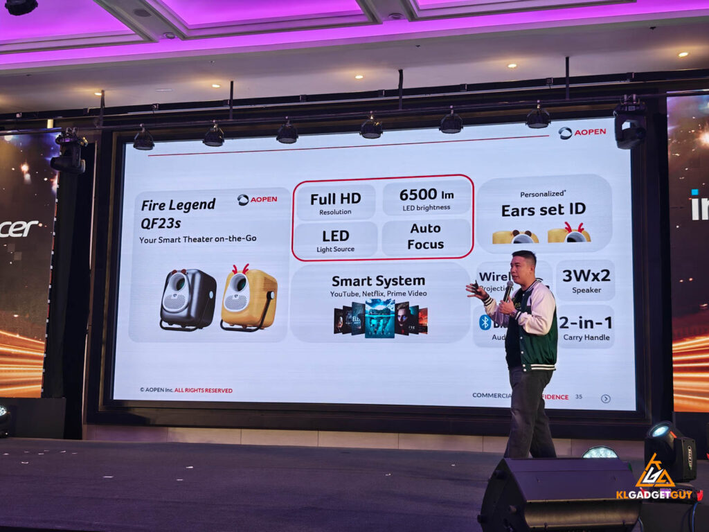 For entertainment on-the-go, Acer introduced the AOpen QF23s smart portable projector, designed to transform any space into a personal theater. Featuring Full HD resolution, 250 ANSI lumens brightness, and instant autofocus, itโs perfect for casual movie nights or portable gaming.