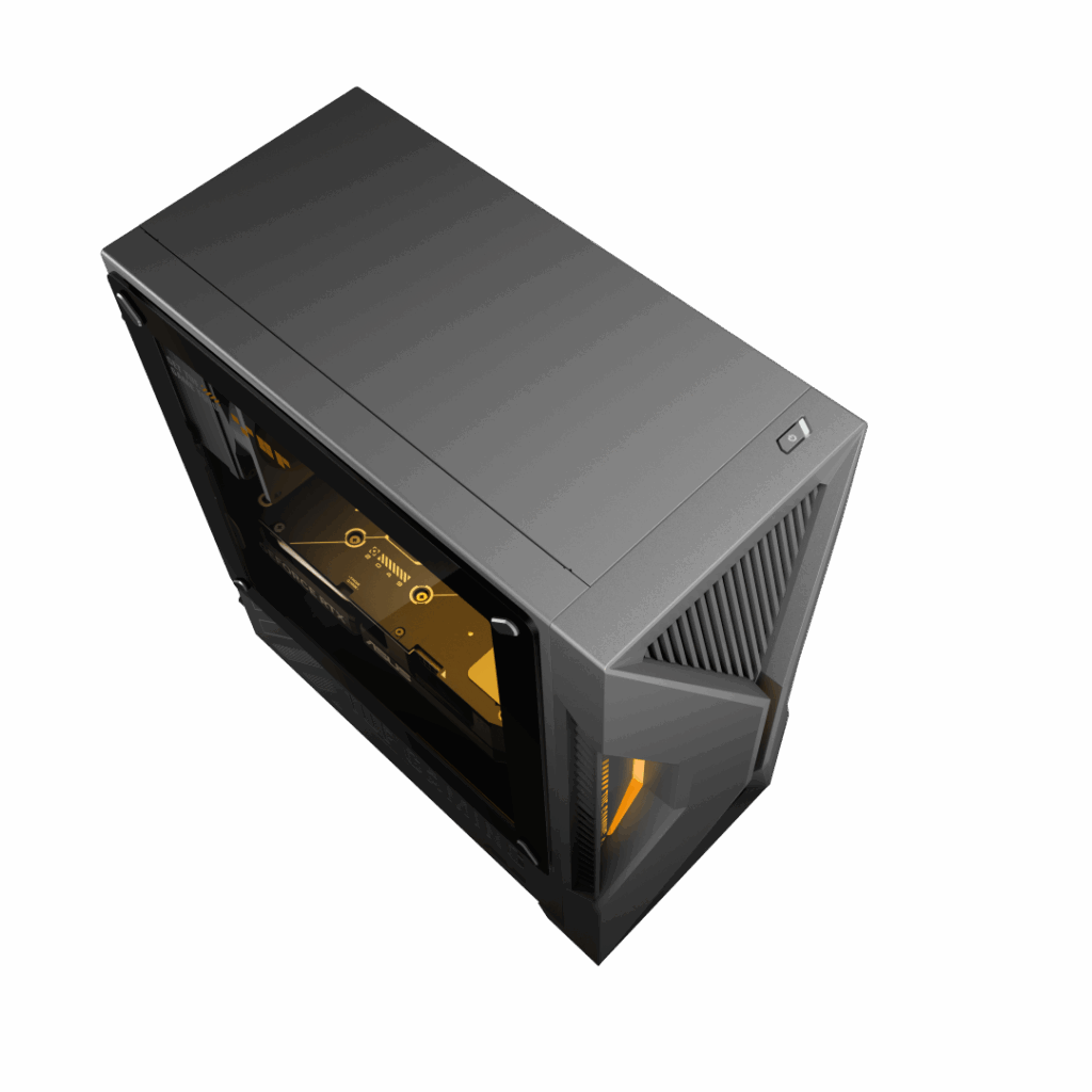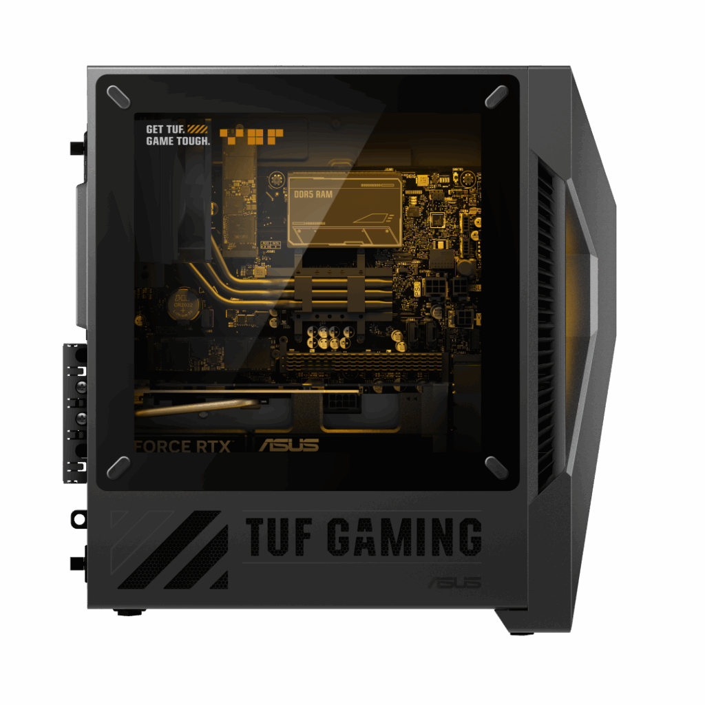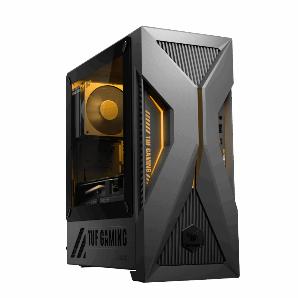 Drawing inspiration from mecha anime, the TUF Gaming T500 features bold, angular design lines and a clear side panel with signature yellow lighting to showcase the powerful components within. Additional lighting on the front I/O panel adds a sci-fi aesthetic, reminiscent of optical sensors on a battle-ready machine.