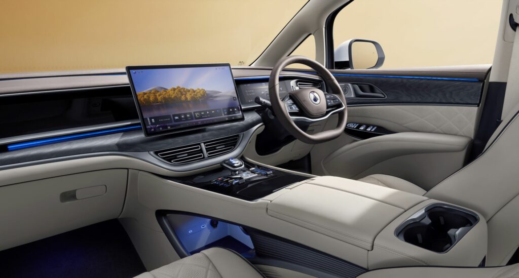 The DENZA D9 is available in three exterior colors: Arctic White, Cosmos Black, and Whale Sea Blue. The interior offers two sophisticated color choices: Beige and Brown, further enhancing the vehicle’s premium aesthetic.