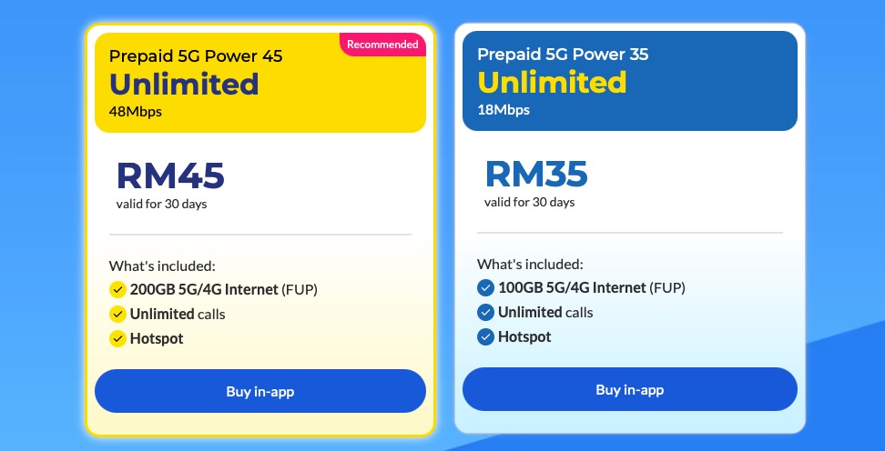 Meanwhile, the Prepaid 5G Power plans are positioned for users who want near-unlimited connectivity throughout the month. These plans come with large data allowances under a fair usage policy, allowing users to stay online without constantly worrying about hitting a hard cap. The Prepaid 5G Power 35, priced at RM35, includes up to 100GB of 5G/4G data under FUP, while the Prepaid 5G Power 45 at RM45 increases the quota to 200GB, both bundled with unlimited calls and hotspot access.