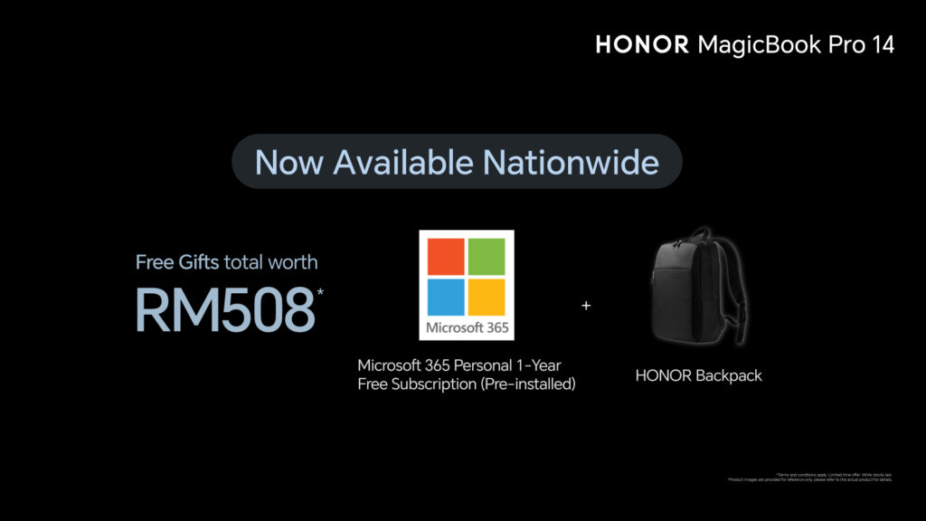 The HONOR MagicBook Pro 14 can be purchased starting today for RM4499 and customers will receive free gifts worth RM508, including a 1-year Microsoft 365 Personal subscription and HONOR Backpack.