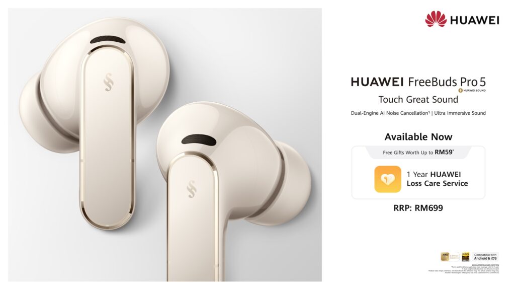 The HUAWEI FreeBuds Pro 5 features a Dual-Driver Acoustic System supporting high-resolution lossless audio transmission for richer sound reproduction. It also incorporates the world’s first dual-driver Dual-Engine AI Noise Cancellation system that adapts to environmental noise in real time. The earbuds are priced at RM699 and available in Grey, White and Gold.
