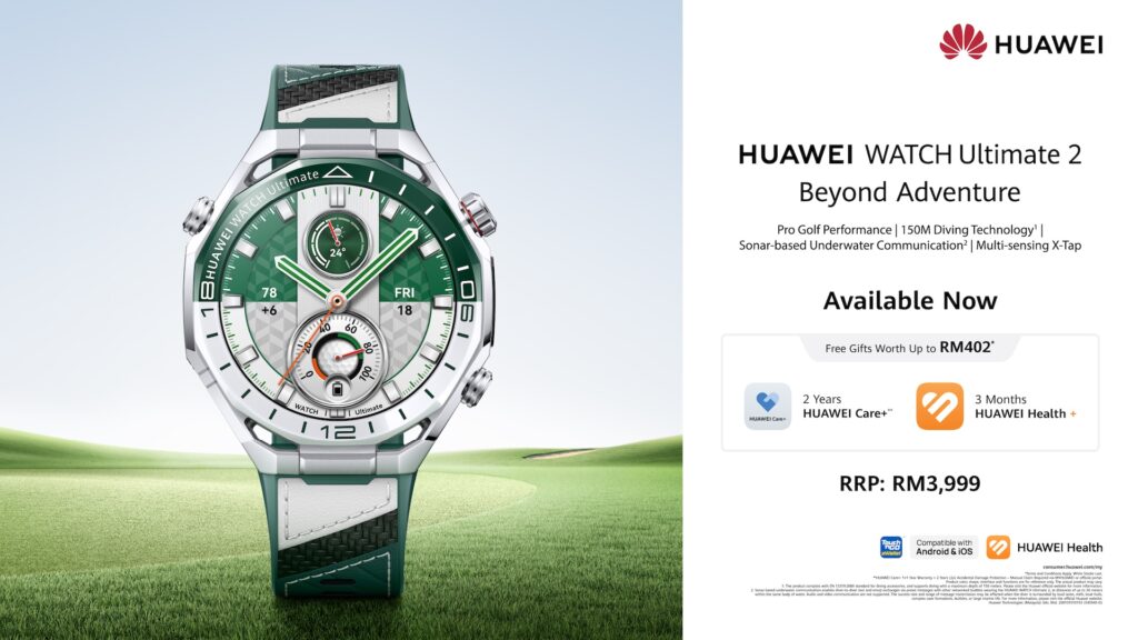 The HUAWEI WATCH Ultimate 2 in Green continues Huawei’s premium outdoor smartwatch series with enhanced golf-focused features alongside its diving capabilities. The smartwatch is priced at RM3,999 and includes free gifts worth up to RM402, including two years of Huawei Care+ and three months of Huawei Health+ membership.