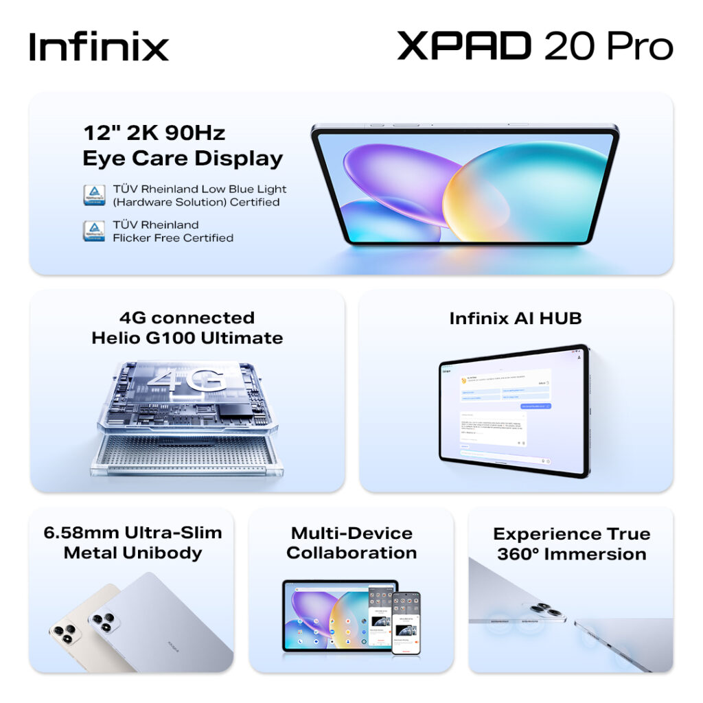 The XPAD 20 Pro is powered by a Mediatek Helio G100 Ultra processor paired with 8GB RAM and 256GB storage, while complementing the 12-inch 2K display is a quad-speaker sound system, the tablet offers 4G connectivity for those wanting to stay always connected on the go, it has an 8000mAh battery to power your day and supports 18W fast charging.