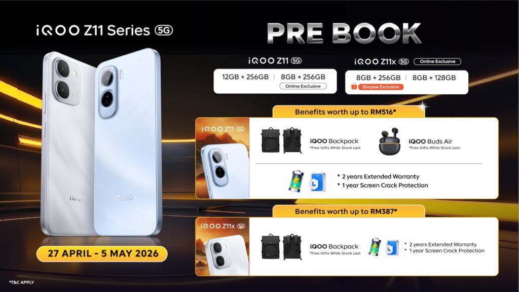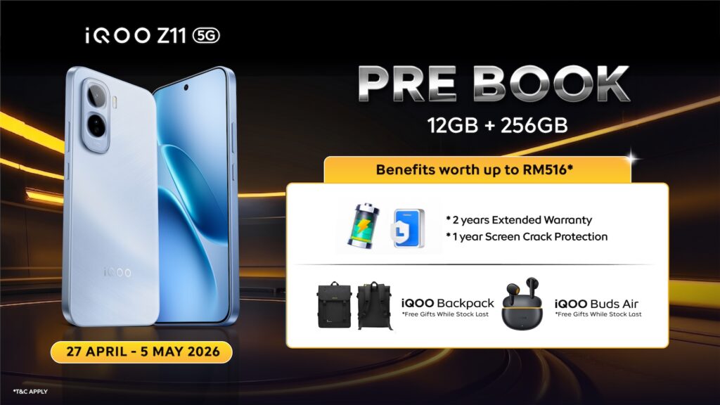 Ahead of the official launch, both the iQOO Z11 5G and iQOO Z11x 5G are now available for pre-booking in Malaysia from 27 April to 5 May 2026. Customers who pre-book the iQOO Z11 5G will receive free gifts worth up to RM516, including an iQOO Backpack, iQOO Buds Air, a 1+1 year extended warranty, and one year of screen crack protection.
