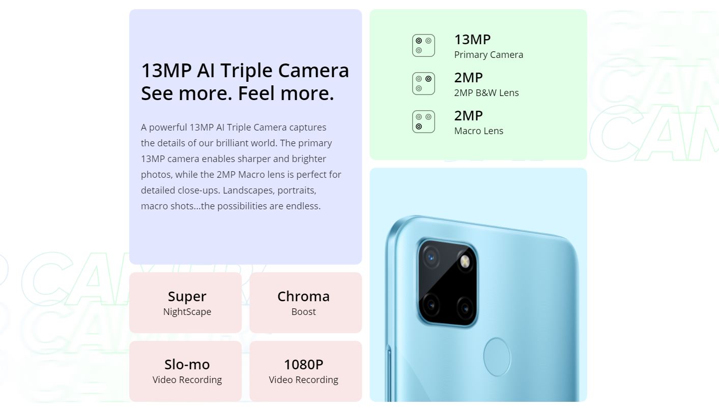 For imaging, the phone comes with a 13MP main shooter, a 2MP macro lens, ad a 2MP B&W sensor.