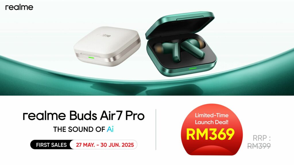 | realme Buds Air7 Pro | Green, White | RM399 | realme Brand Stores, Shopee, Lazada, TikTok Shop, authorised dealers | RM30 off from 31 May – 30 June 2025 |