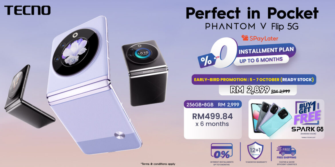 The moment has come for an affordable flip style foldable phone, as Tecno Malaysia has officially introduced the Phantom V Flip in Malaysia at a very attractive price tag of RM2,999, pre-orders have begun at Tecno’s official Shopee store and for a limited time from 5-7 October 2023, the phone can be purchased at just RM2,899 while you get a free Tecno Spark Go smartphone worth RM299 while stocks lasts.