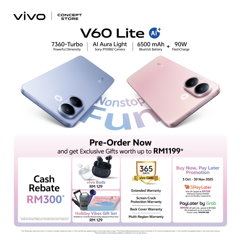 Pre-order customers will receive exclusive gifts worth up to RM1,199, including vivo Buds, a Holiday Vibes Gift Set, 1+1 Year Extended Warranty, 1-Year Screen Crack Protection, 1-Year Back Cover Warranty, and Multi-Region Warranty. vivo Malaysia is also offering RM100 instant savings with Grab PayLater or sPayLater, 0% instalment plans up to 24 months, and trade-in deals for old devices.