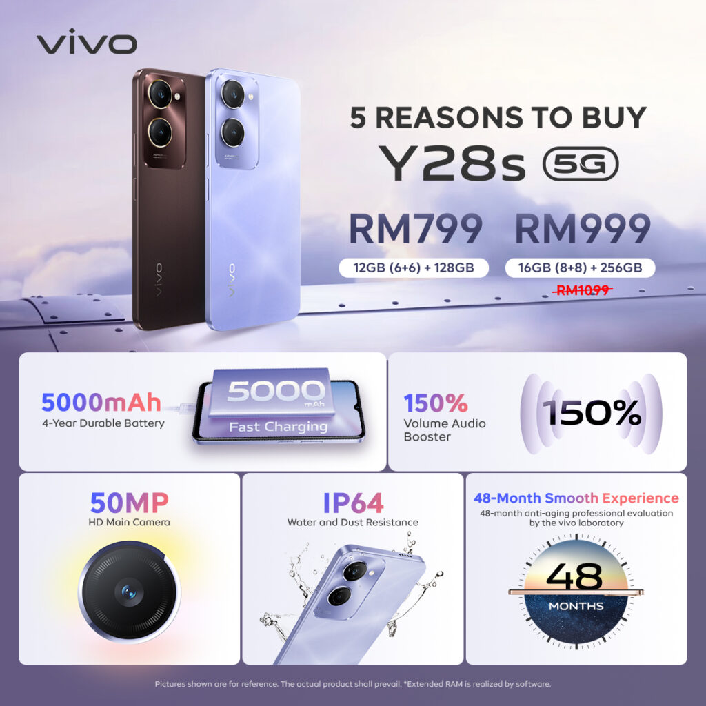 Starting today, the vivo Y28s 5G 6GB RAM + 128GB storage option is priced at RM799, while the 8GB RAM + 256GB storage variant is available for RM1099. For a limited time, the higher-spec option can be purchased at an attractive price of RM999 exclusively at vivo Malaysia’s official stores.